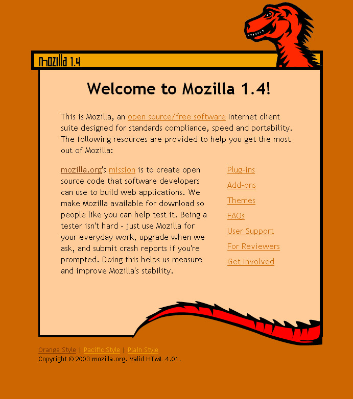 | Description: | This was the first page that anyone installing Mozilla 1.4 recieved. It was a group effort lead by Gervase Markham to update the v1.0 web page. |