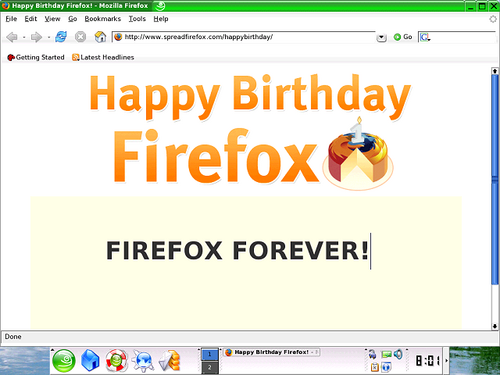 | Description: | Image of the Firefox browser depicting a birthday cake and a message saying "Firefox Forever" |