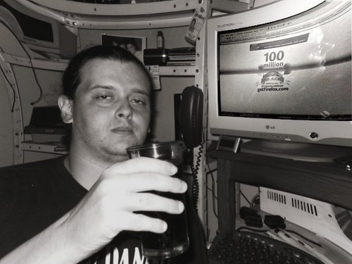 | Description: | Image of a man and his computer, which has the Firefox 100 Million image on it. |