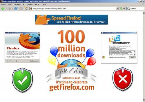 Image of the Firefox 100 Million Downloads message surrounded by other symbols