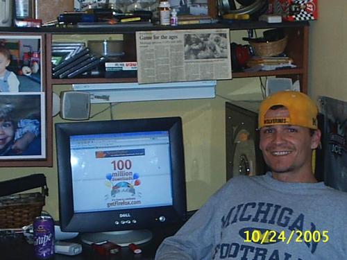 | Description: | Image of a man sitting at his computer with the Firefox 100 Million Downloads logo in the background |