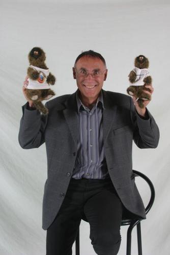 Image of a man holding two stuffed animals