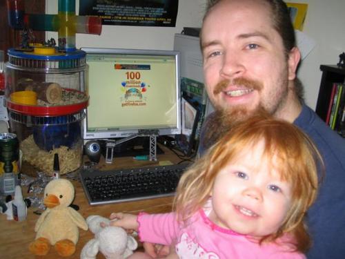 | Description: | Image of a man and his daughter sitting at a computer with the 100 Million Downloads message on the screen |