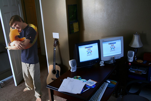 | Description: | Image of a boy embracing a Firefox logo, while in the foreground two computer monitors bear the 100 Million Downloads message |