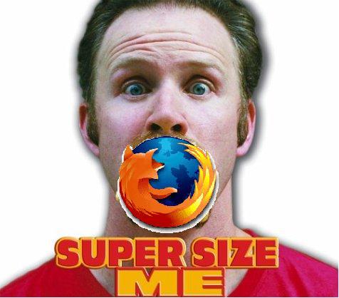 Image of Morgan Spurlock of "Super-size Me" with a Firefox logo in his mouth.