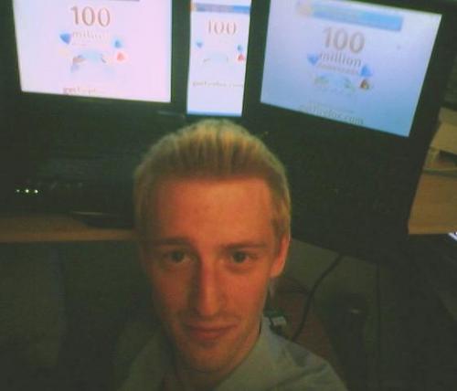 | Description: | Image of a man with three computers with the 100 Million Downloads message on them in the background |
