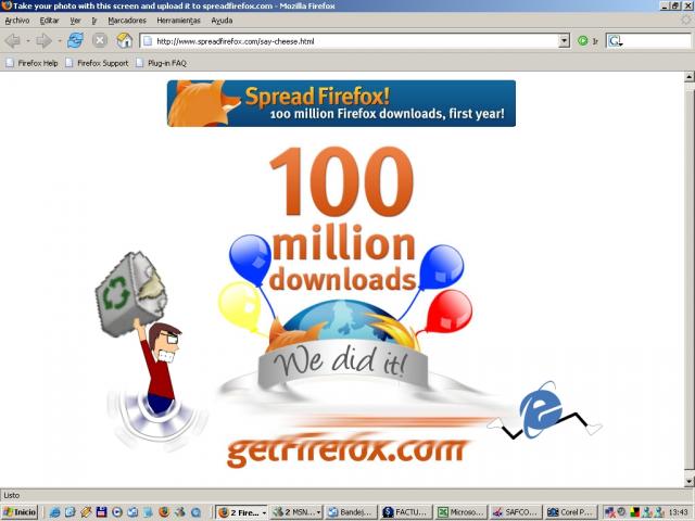 | Description: | Image of the 100 Million Downloads message, with a figure chasing an internet explorer logo across it |