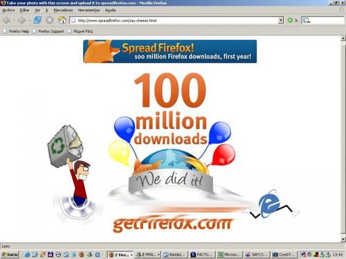 Image of the 100 Million Downloads message, with a figure chasing an internet explorer logo across it