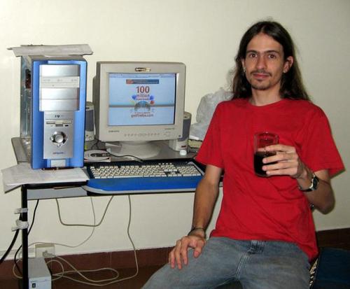 | Description: | Image of a man at his computer with the 100 Million Downloads logo in the background |
