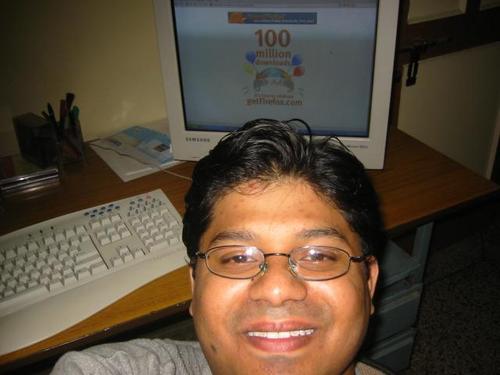 | Description: | Image of a man in front of his computer, which is displaying the Firefox 100 Million Downloads logo |