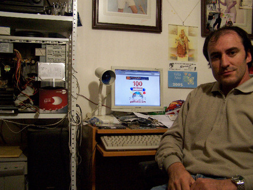 | Description: | Image of a man sitting by his computer, which has the 100 Million Downloads image by it |