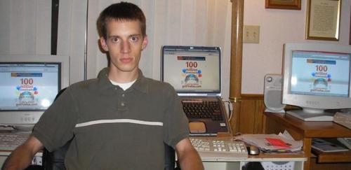 | Description: | Image of a boy sitting in front of three computers, all of them displaying the 100 Million Downloads image |