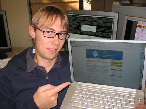 | Description: | Image of a boy pointing to his computer, which has the Camino browser running |